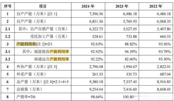 从2022年至2024年(以下简称报告期),福恩股份的产能利用率分别为93.56%、88.82%和92.63%,其中,福恩股份的产能利用率分别为93.79%、94.39%和92.92%,南通远吉的产能利用率分别为93.3%、82.6%和92.22%。