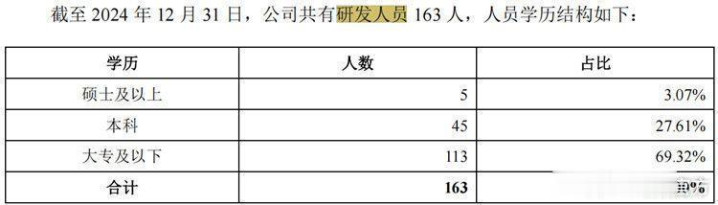 截至2024年12月31日,福恩股份拥有研发人员163人,其中,硕士及以上学历人员为5人,本科学历45人,大专及以下学历为113人。