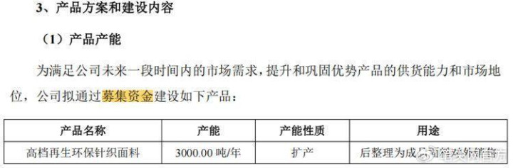 福恩股份募资的第二个项目“高档环保再生材料研究院及绿色智造项目”也将增加该公司未来的产能。高档再生环保针织面料未来产能为3000吨/年。