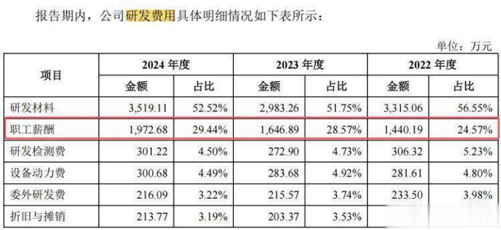 报告期内,福恩股份的研发材料投入分别为3,315.06万元、2,983.26万元和3,519.11万元,占研发费用的比例分别为56.55%、51.75%和52.52%。同期该公司的研发费用中职工薪酬分别为1,440.19万元、1,646.89万元和1,972.68万元,占研发费用的比例分别为24.57%、28.57%和29.44%。
