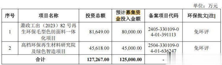 招股书显示,此次IPO,福恩股份计划募集资金12.5亿元,其中8亿元用于萧政工出(2023)82号再生环保毛型色纺面料一体化项目,4.5亿元用于高档环保再生材料研究院及绿色制造项目。